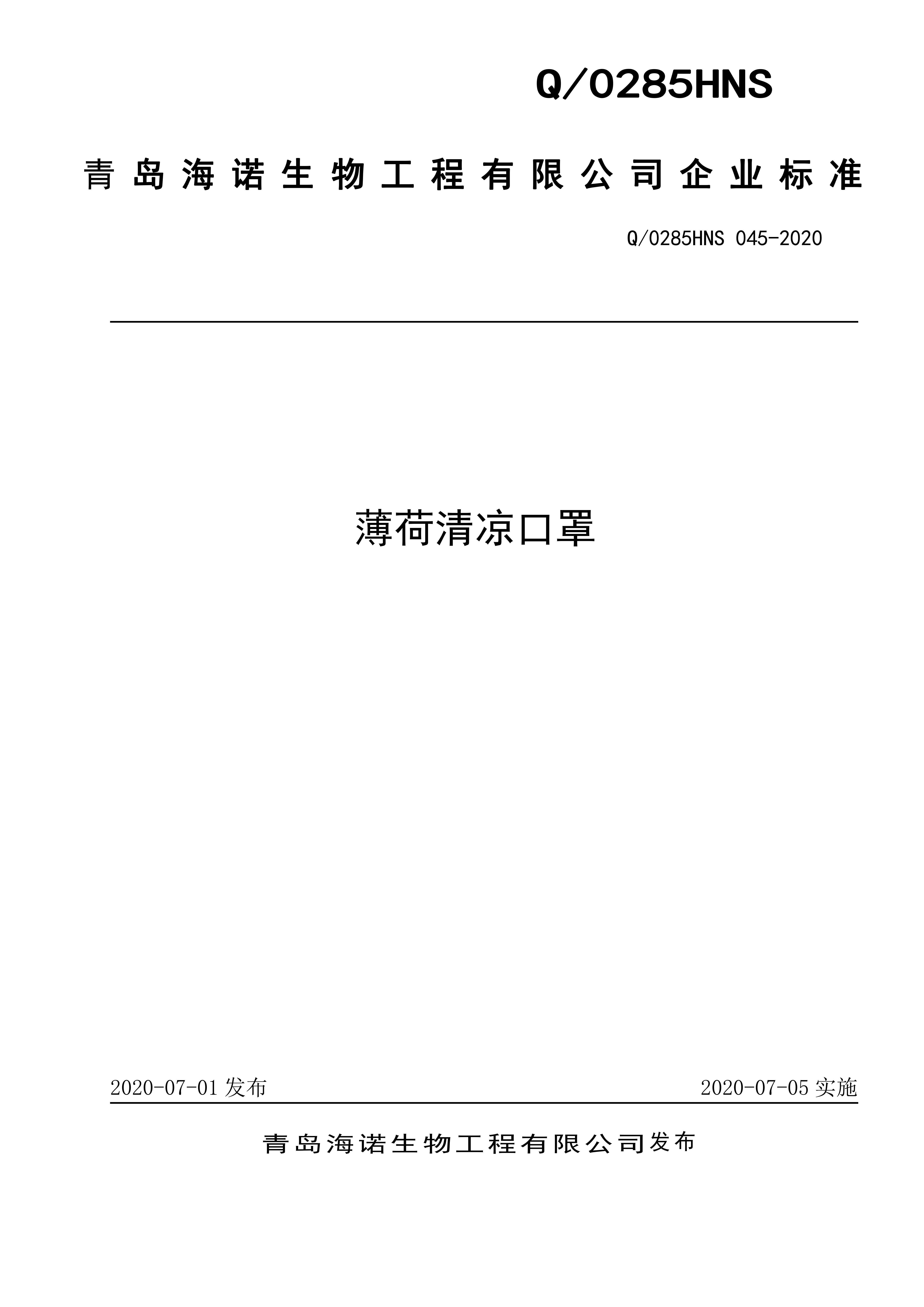 青岛海诺生物工程有限公司企业标准 — 薄荷清凉口罩